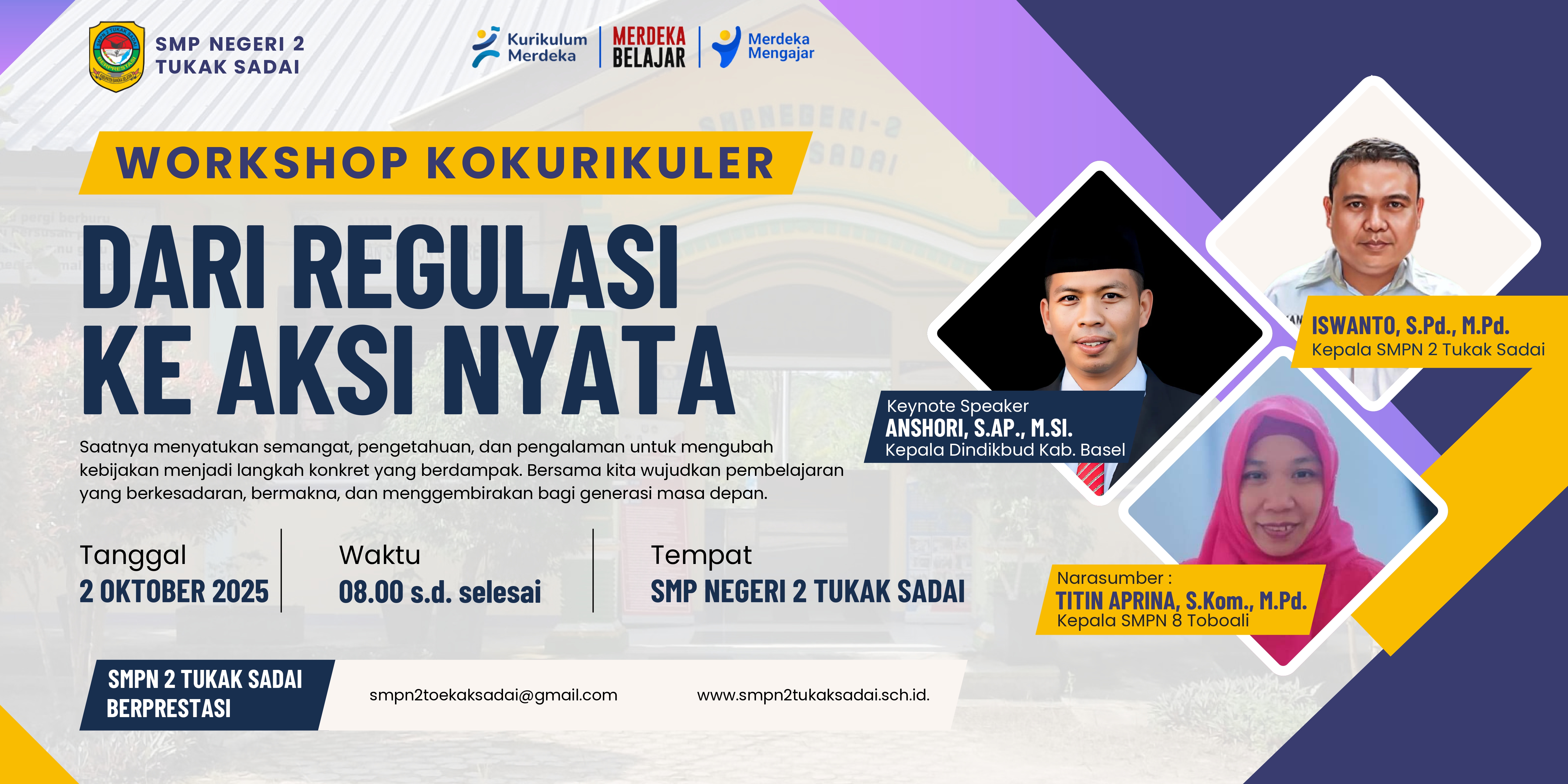 Transformasi pendidikan tak lagi sekadar wacana. SMP Negeri 2 Tukak Sadai memimpin langkah dengan menyelenggarakan Workshop Kokurikuler bertajuk “Dari Regulasi ke Aksi Nyata”, Kamis, 2 Oktober 2025. Kegiatan yang akan berlangsung sejak pukul 08.00 WIB ini menghadirkan narasumber utama Anshori, S.AP., M.Si., Kepala Dinas Pendidikan dan Kebudayaan Kabupaten Bangka Selatan, serta Titin Aprina, S.Kom., M.Pd., Kepala SMP Negeri 8 Toboali.